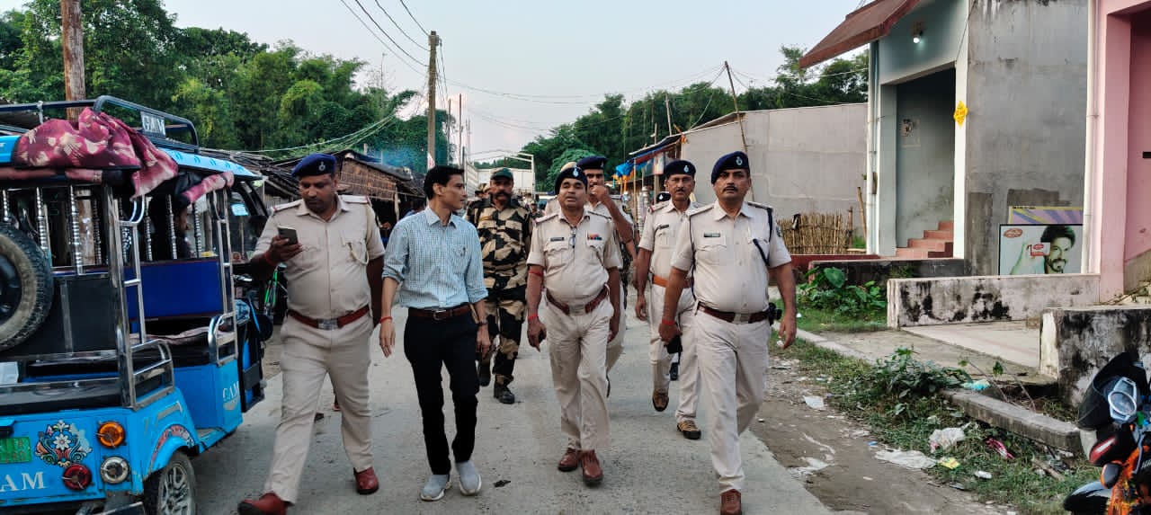 फ्लैग मार्च में पुलिस बल के जवानों के साथ प्रशासनिक पदाधिकारी एवं स्थानीय थानाकर्मी शामिल