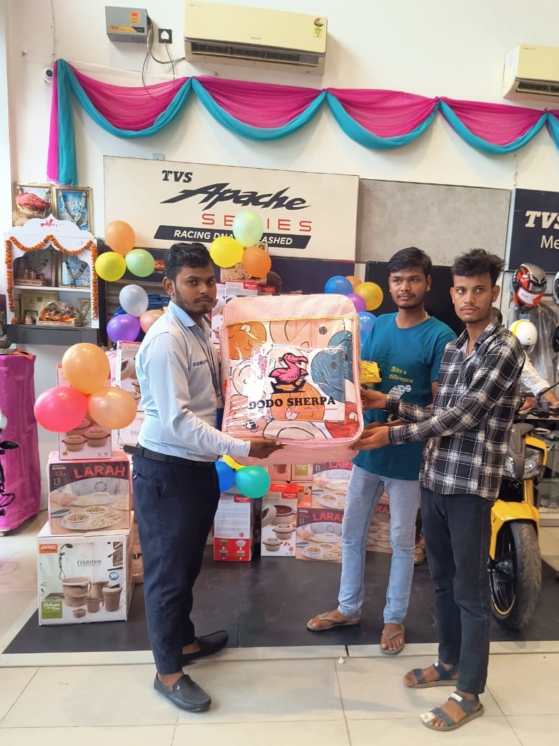 टीवीएस शोरूम के प्रबंध निदेशक चिरंजीव खेमका ने बताया कि नवरात्र से धनतेरस तक हर गाड़ी की खरीद पर स्क्रैच कूपन के माध्यम से निश्चित ब्रांडेड उपहार ग्राहकों को ऑन-स्पॉट प्रदान किए जा रहे हैं। इस वर्ष उपहारों में ट्राली बैग, मिक्सर ग्राइंडर, इलेक्ट्रिक कुकर, डिनर सेट, बाल्टी सेट, कैसेरोल सेट, ब्लैंकेट सेट और अन्य कई आकर्षक आइटम शामिल हैं।