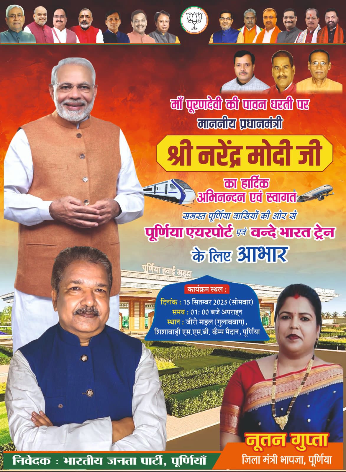 प्रधानमंत्री नरेंद्र मोदी के 15 सितंबर को पूर्णिया आगमन को लेकर भारतीय जनता पार्टी (भाजपा) की तैयारियां जोरों पर हैं। भाजपा जिलामंत्री श्रीमती नूतन गुप्ता अपने कार्यकर्ताओं के साथ ढोल नगारे बजाते हुए शहर से लेकर ग्रामीण क्षेत्र के प्रमुख बाजार व चौक-चौराहे पर आमजन के बीच प्रधानमंत्री मोदी के आमंत्रण पत्र वितरित कर रही हैं।