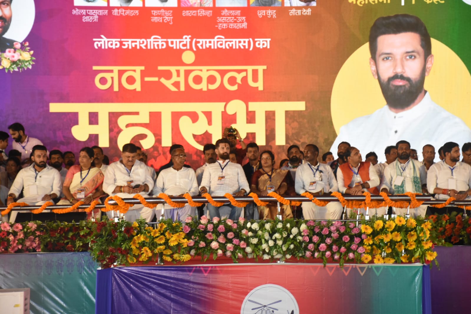 आज रंगभूमि मैदान में लोजपा (रामविलास) की नव संकल्प महासभा आयोजित की गई, जिसमें पार्टी के राष्ट्रीय अध्यक्ष और केंद्रीय मंत्री चिराग पासवान ने सभा को संबोधित किया। मंच पर पार्टी के कई बड़े नेता उनके साथ मौजूद थे। सभा में मंच पर बिहार के पहले दलित मुख्यमंत्री स्व भोला पासवान शास्त्री को श्रद्धांजलि दी गई। इस मौके पर केंद्रीय मंत्री सह राष्ट्रीय अध्यक्ष चिराग पासवान ने कहा की मुझे गर्व है कि उनकी जयंती पर इस महासभा का आयोजन हो रहा है।”पूर्णिया के रंगभूमि मैदान में आयोजित इस नव संकल्प महासभा में बिहार के सात जिलों के लोग शामिल हुए। पूरे शहर और मैदान में चिराग पासवान जिंदाबाद और बिहार का भविष्य चिराग पासवान के साथ के नारे गूंजते रहे। जिला प्रशासन ने सुरक्षा के व्यापक इंतजाम किए, पार्किंग और ट्रैफिक के लिए अलग व्यवस्था की गई और पुलिस गश्त बढ़ाई गई थी ।